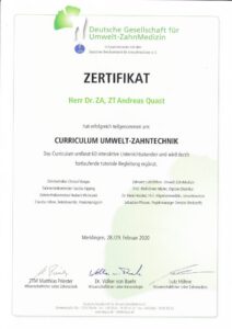 Herr Zahnarzt Dr. Quast hat wiederum das Curriculum Umweltzahntechnik absolviert.
