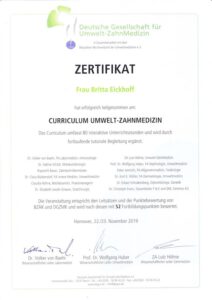 Frau Zahnärztin Eickhoff hat die das Curriculum Umweltzahnmedizin absolviert.