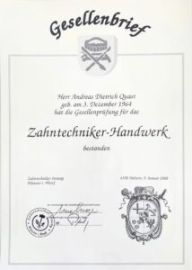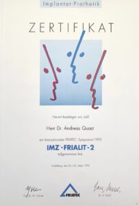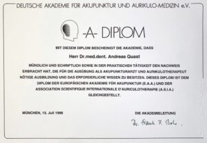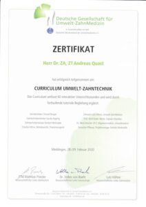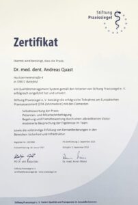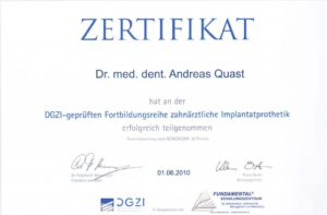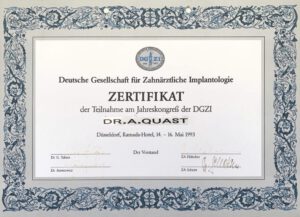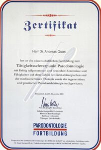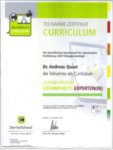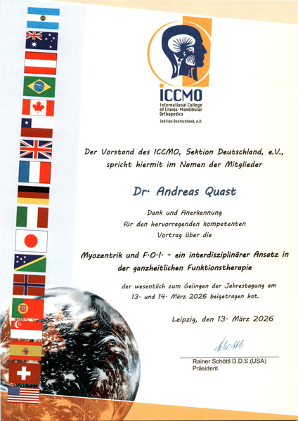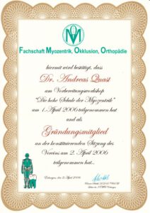 Zusätzlich absolvierte Dr. Andreas Quast die Ausbildungsreihe in der Myozentriktherapie und ist Gründungsmitglied der Myozentrik-Fachschaft für erfahrene Kiefergelenkstherapeuten. In seiner gesamten Laufbahn wurden durch ihn zum Beispiel mehr als 2.500 Schienentherapiefälle bei Patienten behandelt.